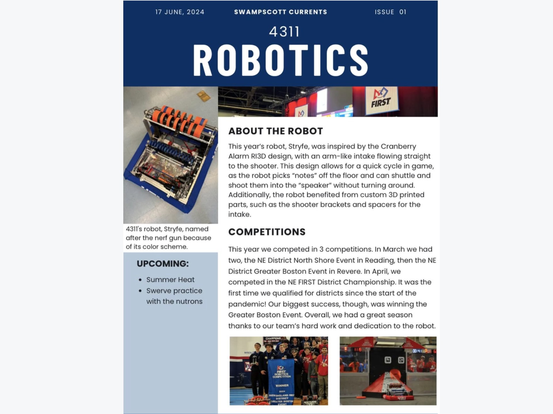 In the end, the design proved reliable and we performed well in competition. We played effectively as a support bot and ended up winning the NE District Greater Boston Event in Revere as part of our alliance, as well as qualifying and competing at the New England District Championship in Springfield. This was the first time our team had qualified for that competition since COVID.