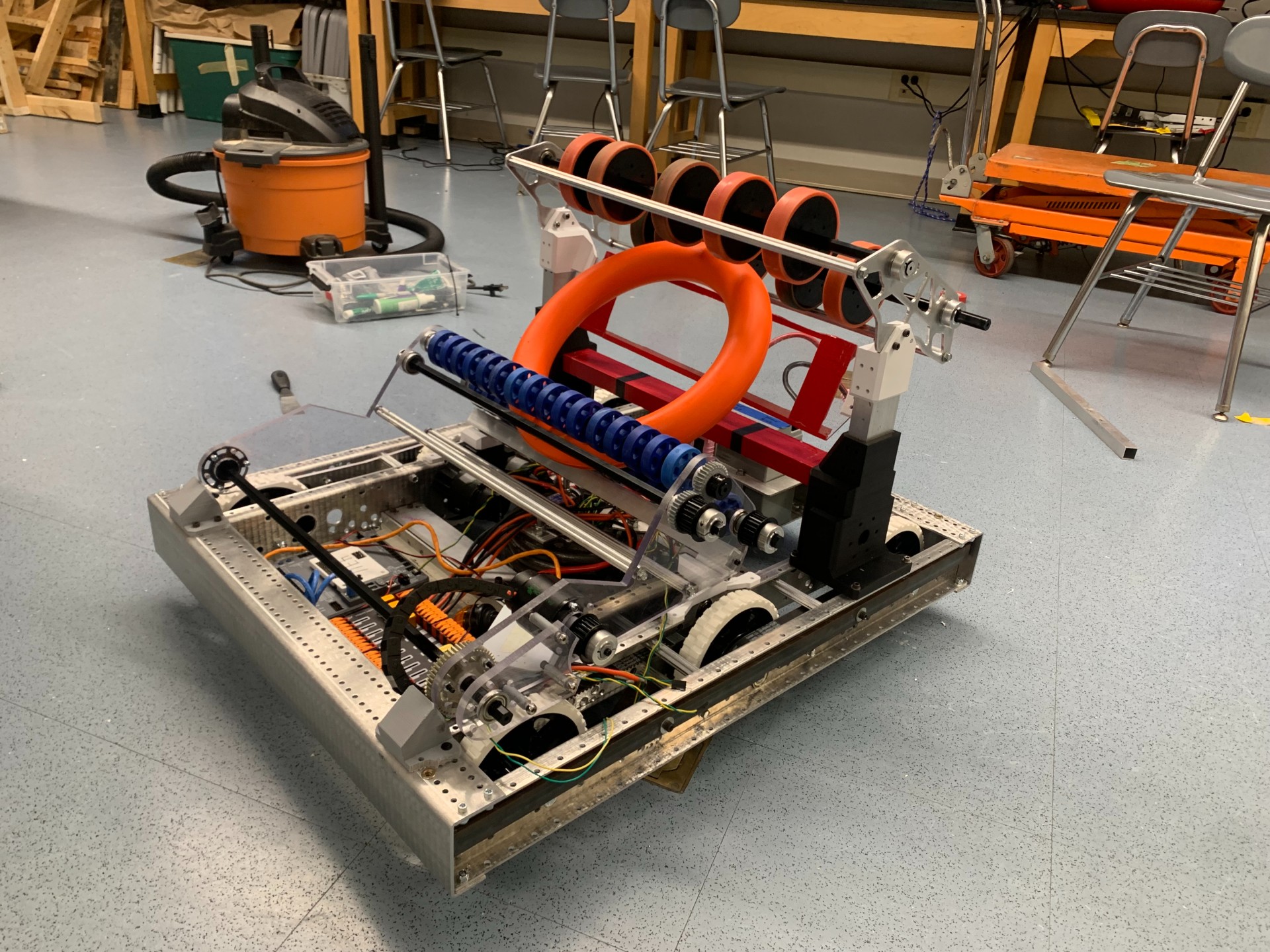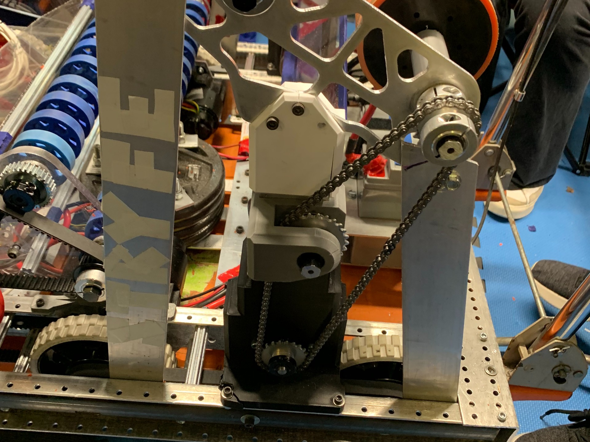 The intake used a 9:1 Banebots reduced gearbox with a belt-driven end effector. The shooter was direct driven with two manually tensioned chains and sprockets, which let us maintain consistent wheel speed while keeping the system simple to service.